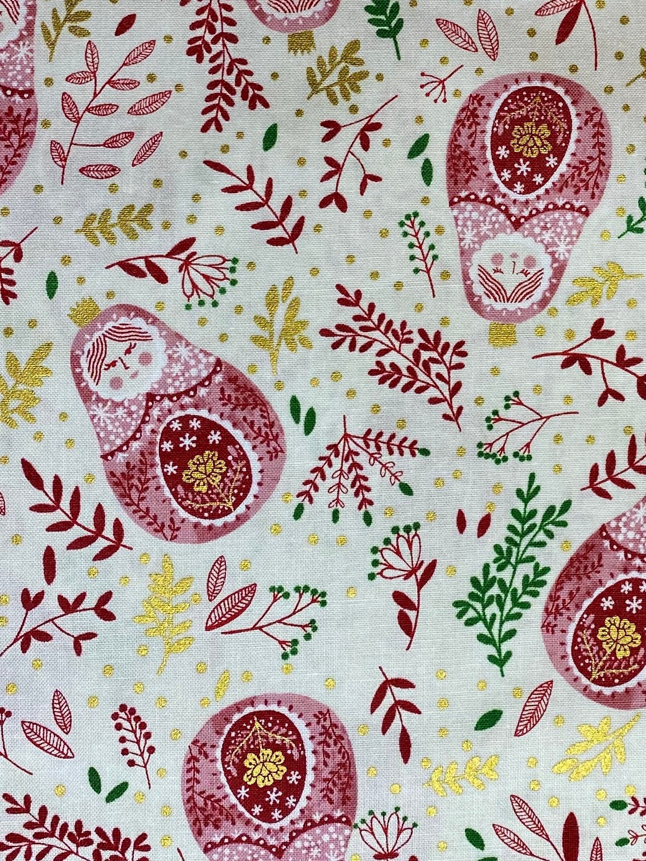 These bags have a cranberry red grosgrain ribbon. There is gold metallic detail on this fabric, you can see it in the second photo.
